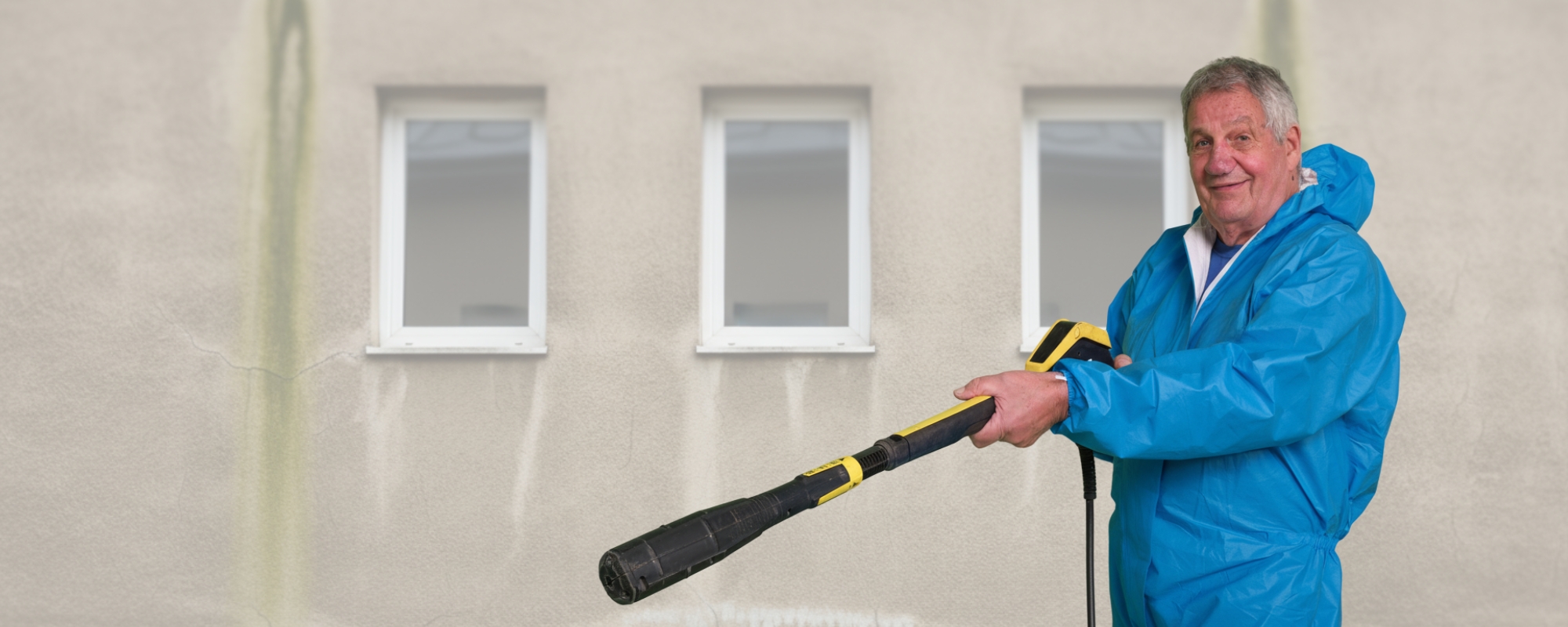 Reinigungskraft von Glanzkommando bei der Fassadenreinigung in Aschaffenburg mit Hochdruckreiniger